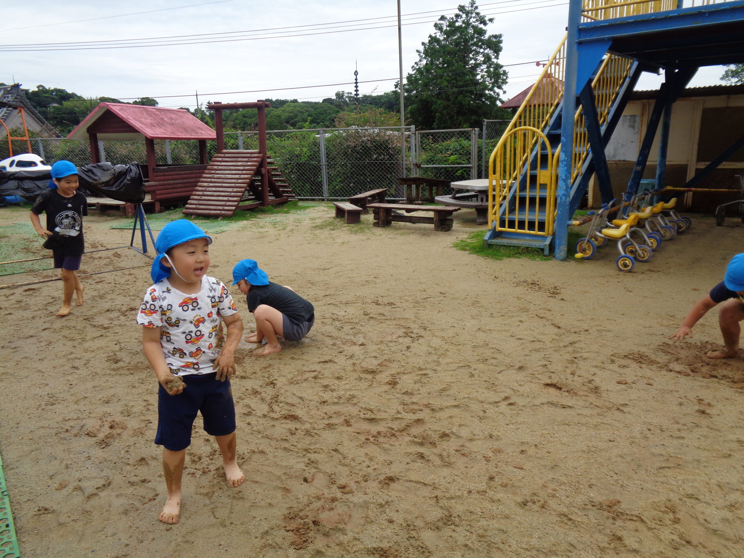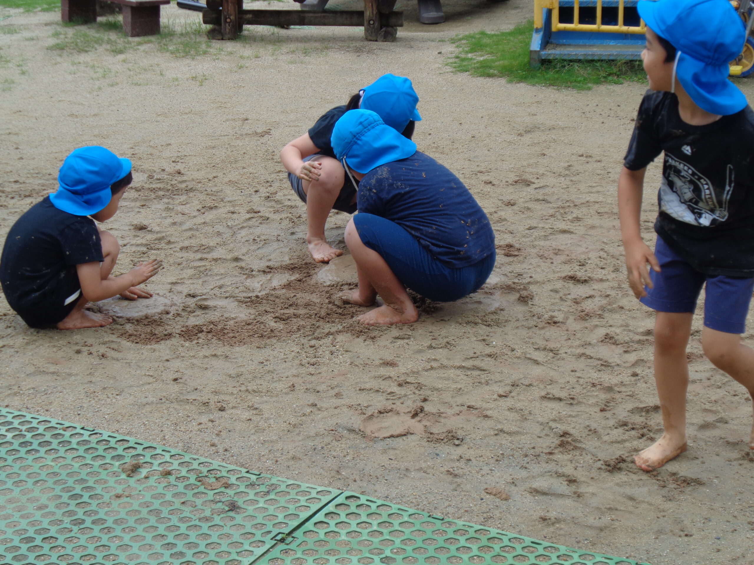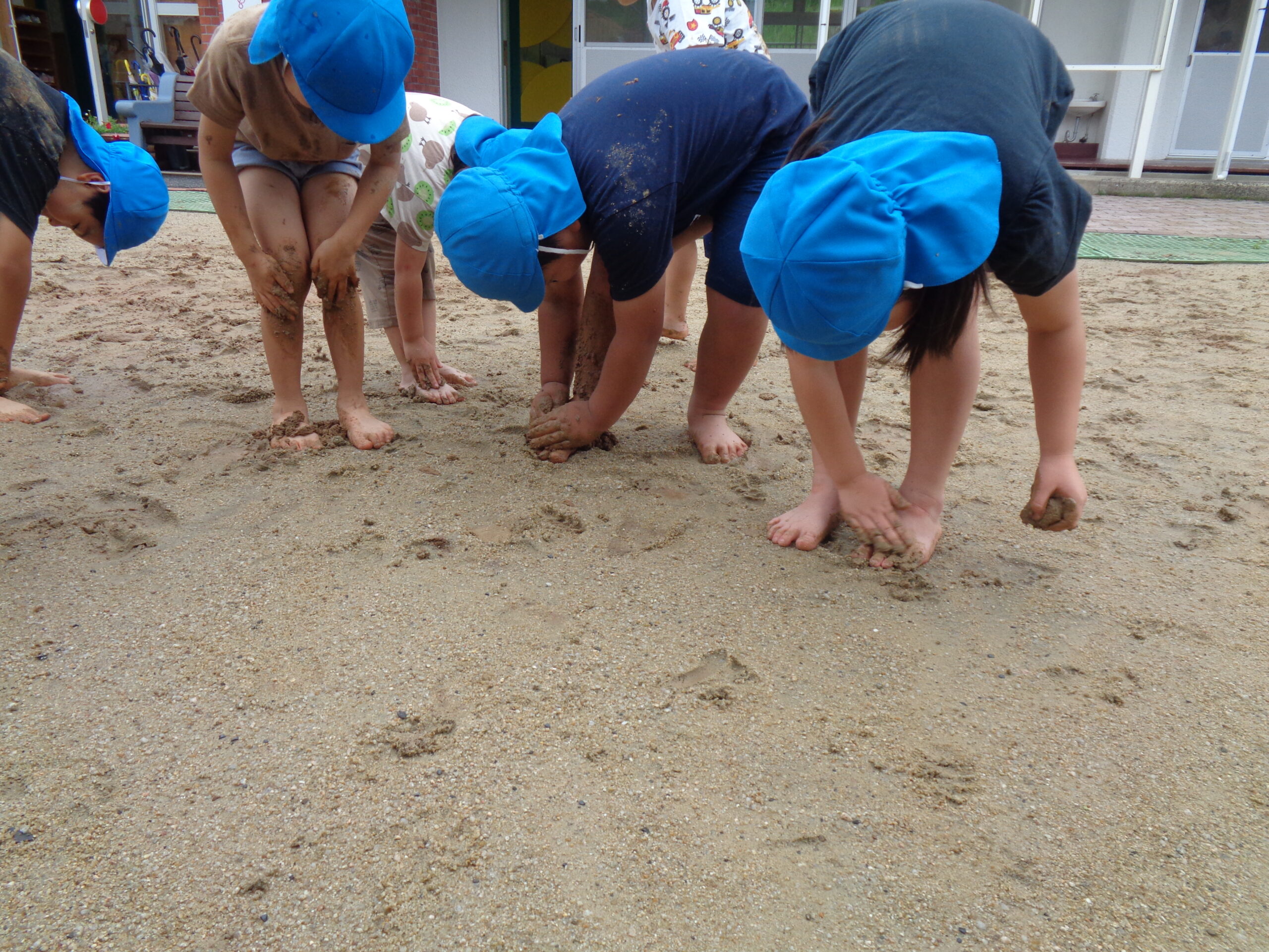 泥団子投げ合いの激しいこと。最後は泥ケーキを作り「美味しそう!」の声。