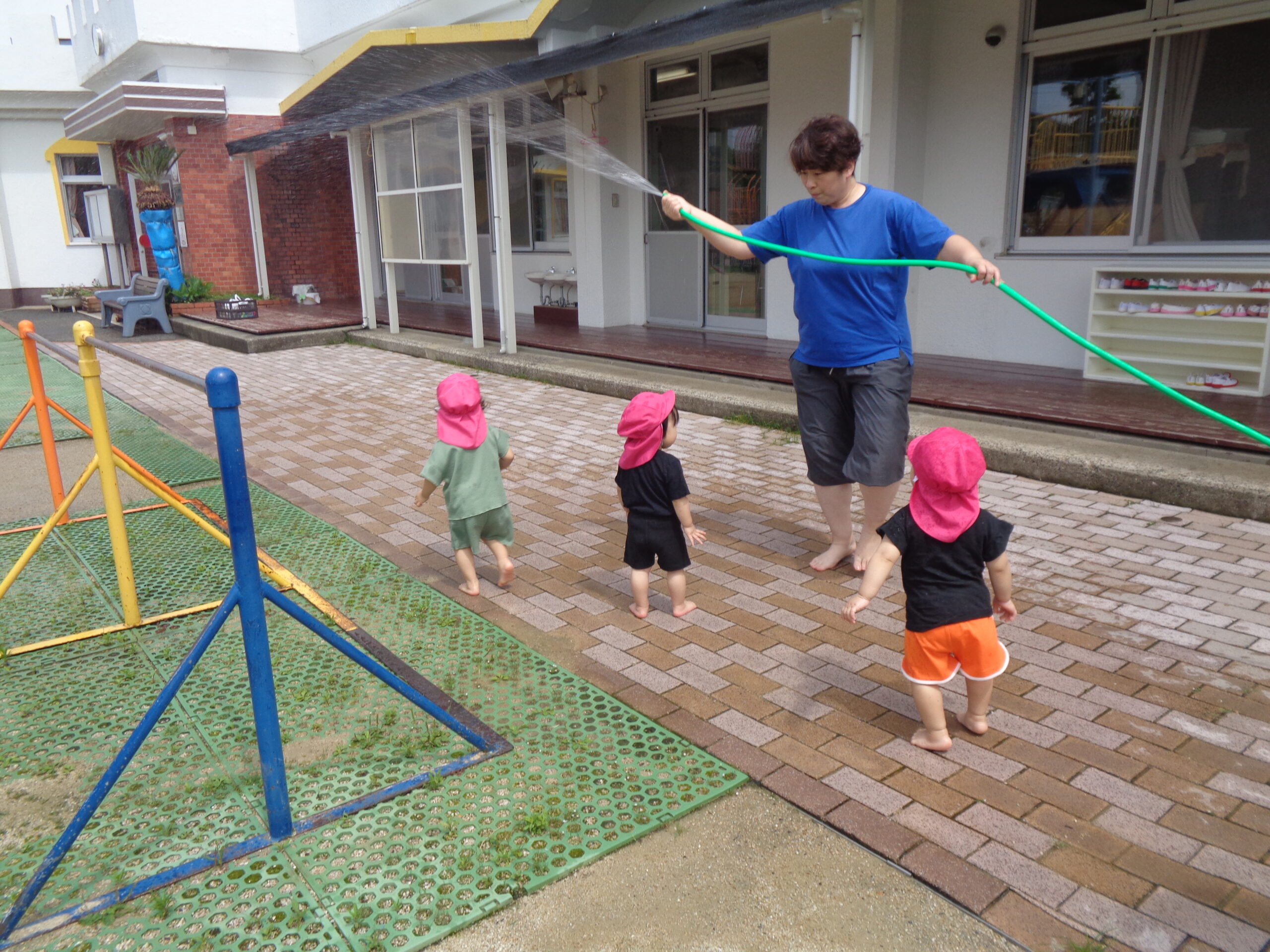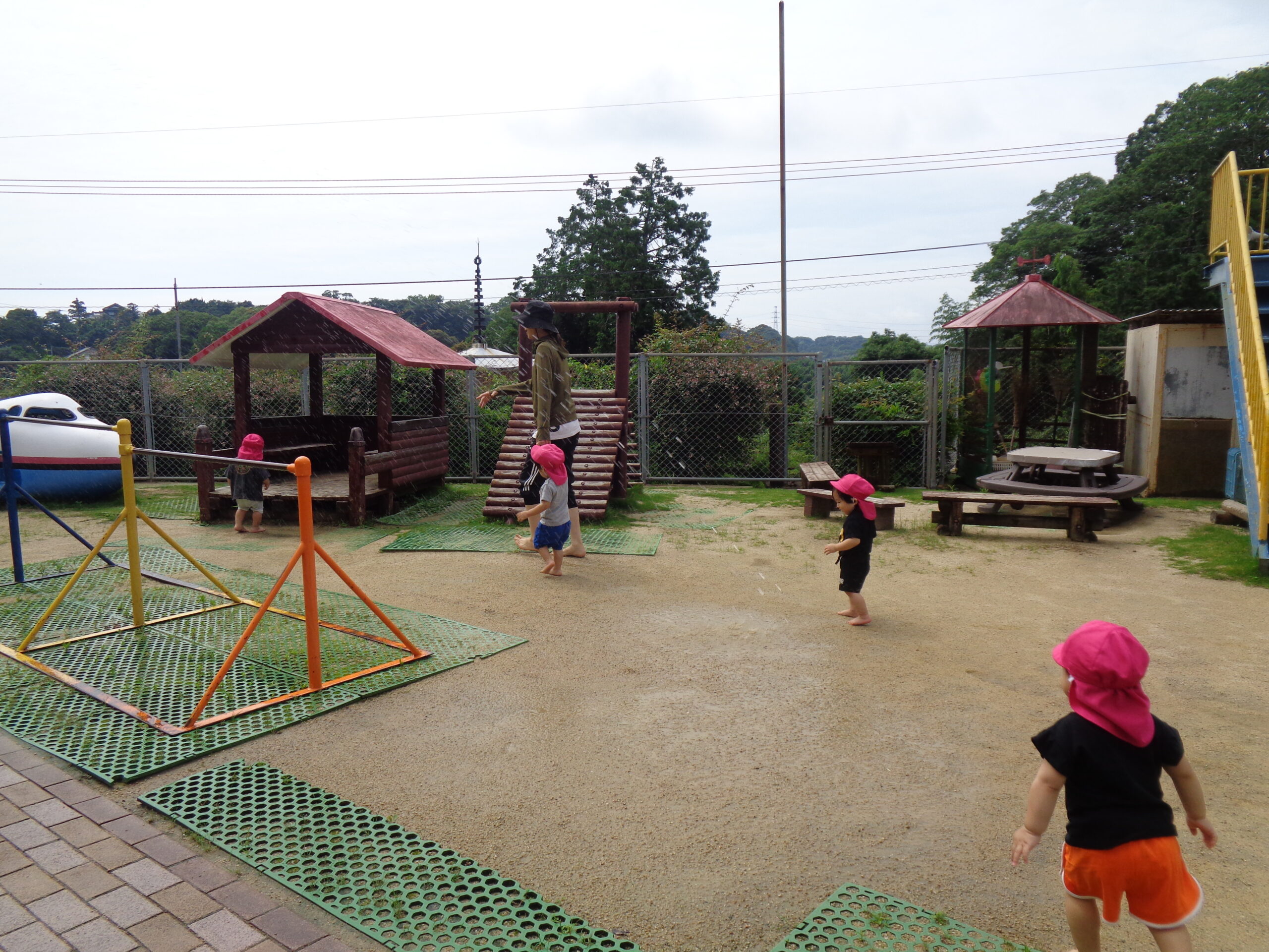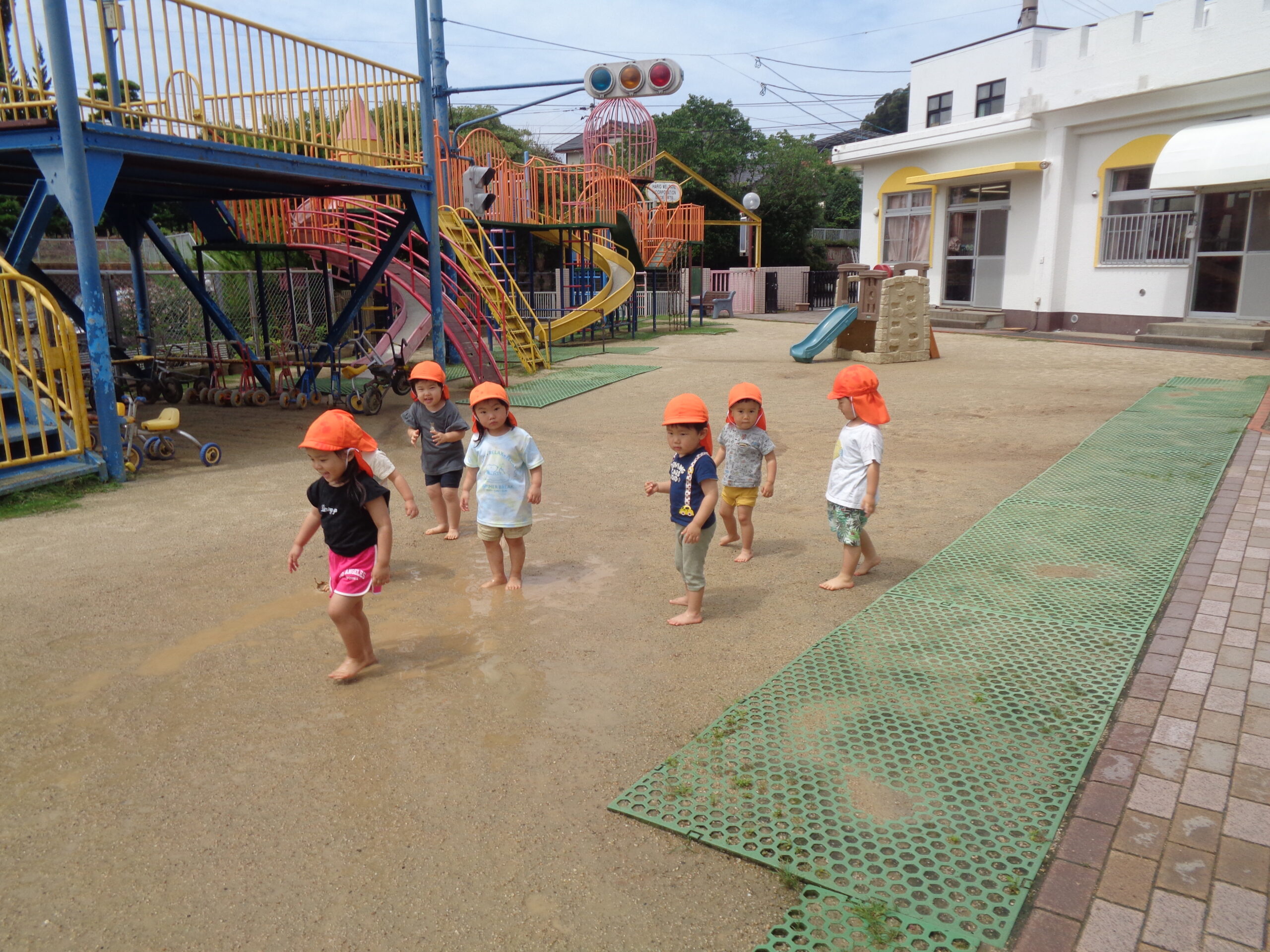 熱中症指数(WBGT)を計り、「さぁ、お外に行くよ~」の声掛けに、