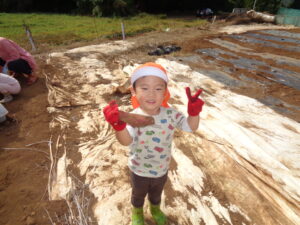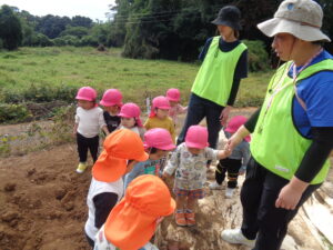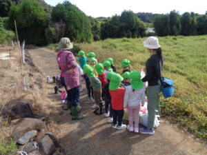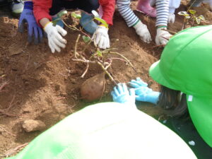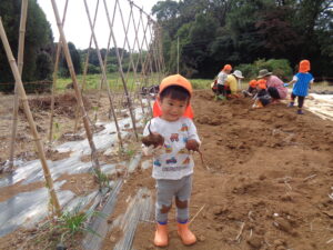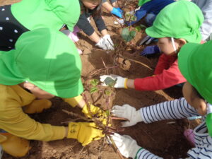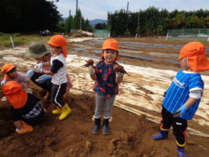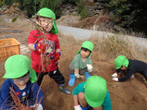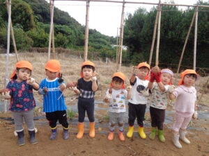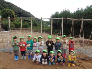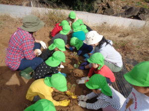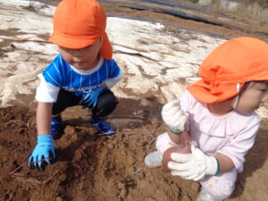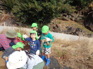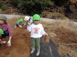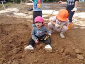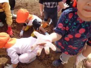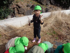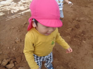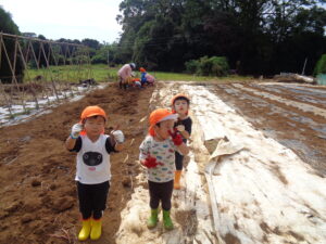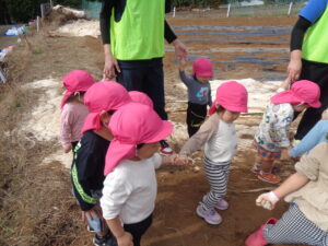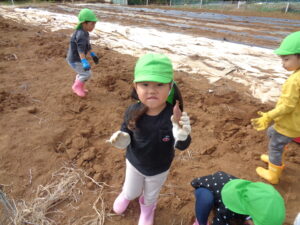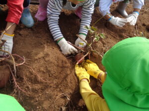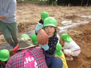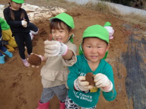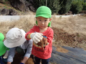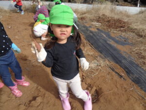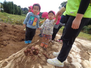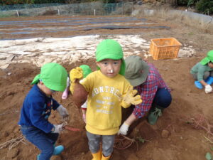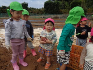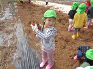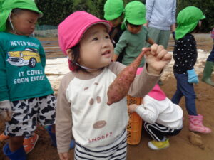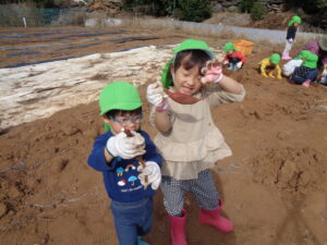 百合組と薔薇組の芋掘り 2025.11.05 先月、桜組と菊組の芋掘りの様子を見学していた百合組と薔薇組の子ども達。自分達も芋掘りをしたい!と芋畑に行ってきました。 実際に掘ってみると、土が硬くてなかなか掘れず。皆で頑張って掘り進めました。 小さいお芋出てきたよ さあ、頑張るぞ! 大きいでしょ! やっと掘れたよ。 菫組さんもお散歩の途中で見学にやってきました。「お芋みせてくださ~い」 大きいお芋。重たいよ~。 最後に皆で「はい。チーズ😀」 Tweet Share Hatena Pocket RSS feedly Pin it