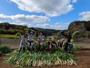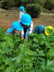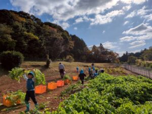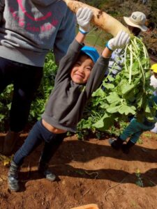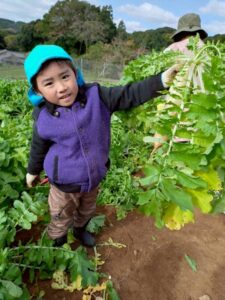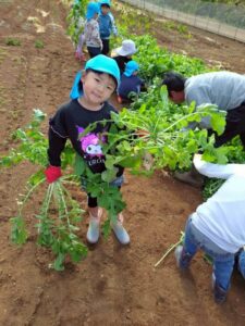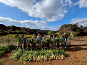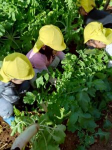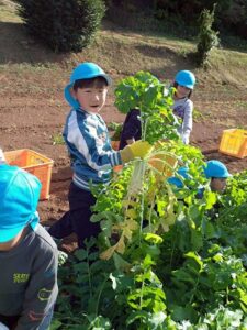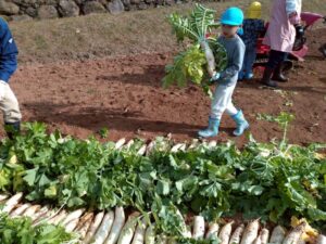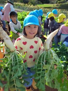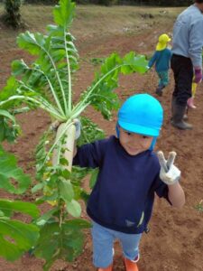 大根引き 2025.12.12 田平の畑に大根引きに行きました。広い畑の大根を、畑の先生から引き方を教えて頂いて始めました。土が柔らかく抜けやすい大根や、大きい大根は「一緒にぬこう!」と声を掛け合って頑張っていました。「初めてする!」と年中さんは懸命に取り組んでいました。「おでんにしてもらおう」と嬉しそうでしたよ。 Tweet Share Hatena Pocket RSS feedly Pin it