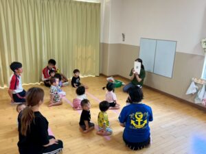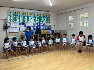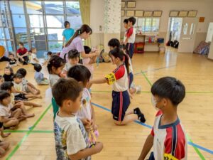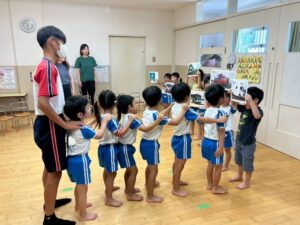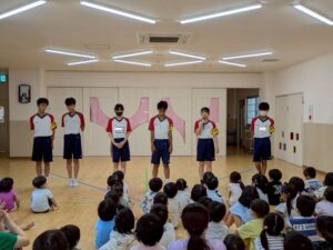 今年も小佐々中学校の2年生のお兄さん、お姉さんが職場体験に来てくれました。卒園生も交えて6名の皆さん、それぞれのクラスに入って子どもたちといっぱい関わってくれました。子どもたちも「明日も来らす?」と毎日が楽しそうでした。3日間大変お世話になりました。