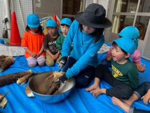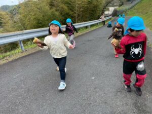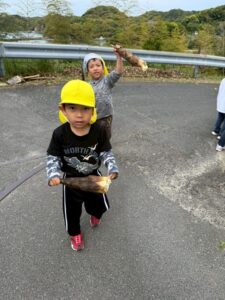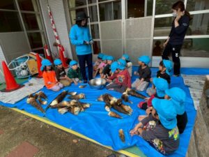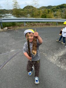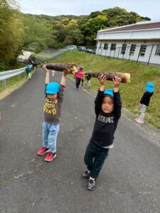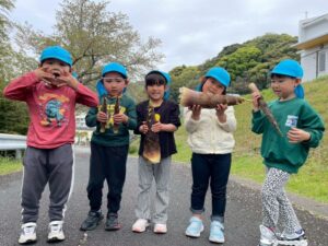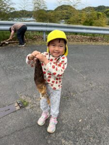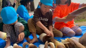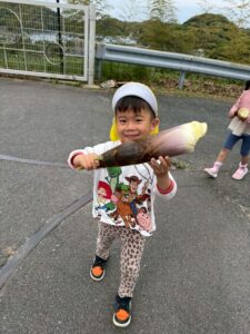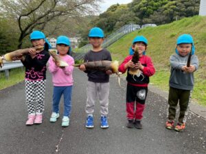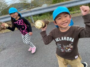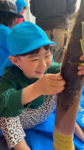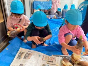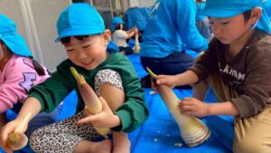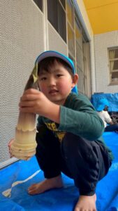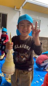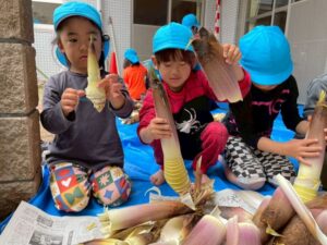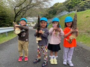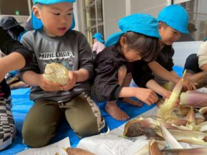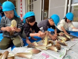 今年も保育所の坂の横に沢山の筍が顔を出しました。年度初めは毎年恒例の筍堀。掘るのは先生ですが、みんなは坂の上から、「せんせいあそこ!」と知らせてくれます。とった筍は子どもたちが保育所まで運び、年長さんが皮むきをしてくれました。「なんか、皮気持ち悪い!」「沢山お洋服きすぎ!」「どこまでむいていいかわからん!」といろんなことに気が付きながらせっせとむいてくれました。むいた筍は給食の先生がおいしく調理してくれましたよ。
