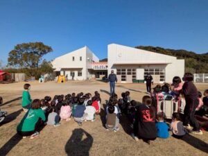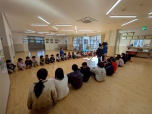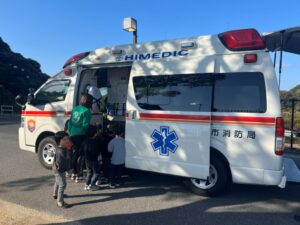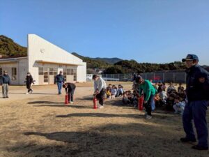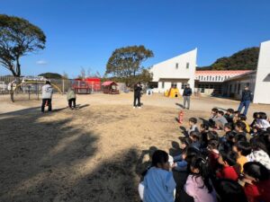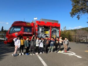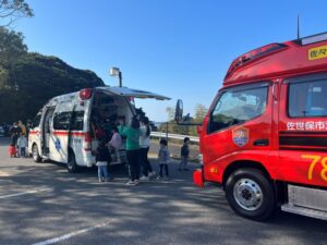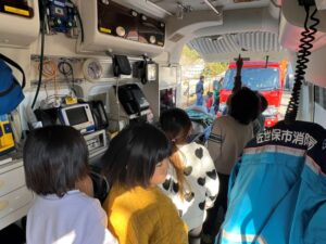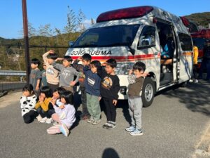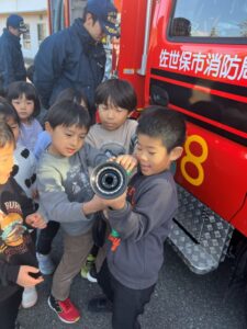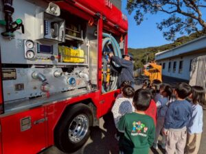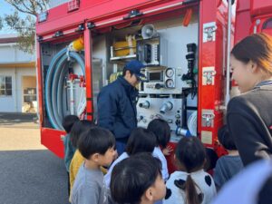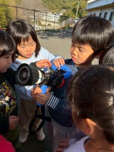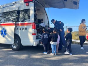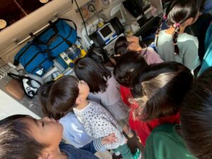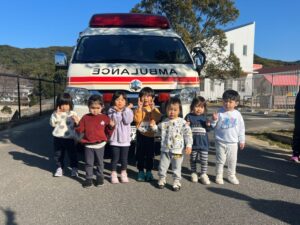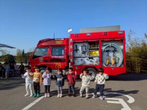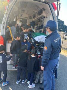 給食室から出火の想定で避難訓練を行い、サッカーゴールを出火場所に見立てて消火訓練を行いました。先生たちの消火器の使い方を見て子どもたちは大声援を送ていました。消火訓練の後は消防車と救急車の前でパチリ!消防士に「これは何ですか!」と沢山質問していました。「消防士になるにはどうしたらいいですか?」の質問には「たくさん勉強してね!」でした。今度は消防署に行かせてもらいましょう。
