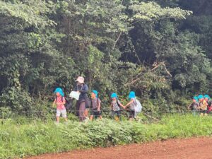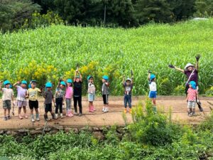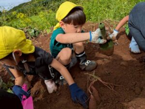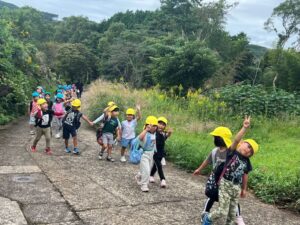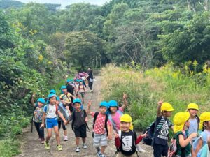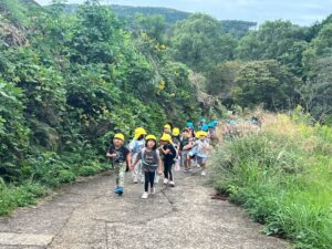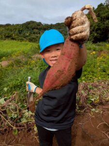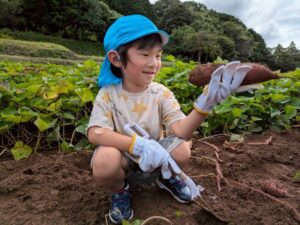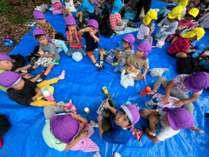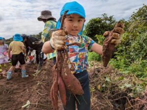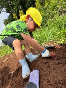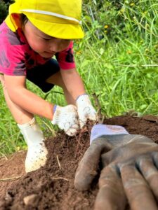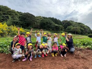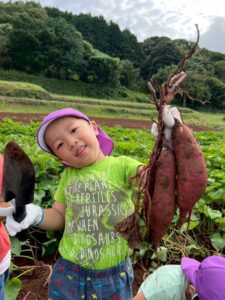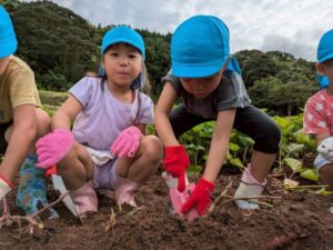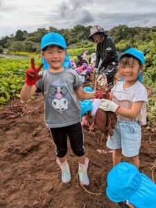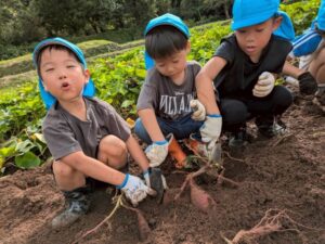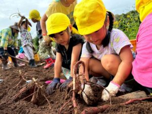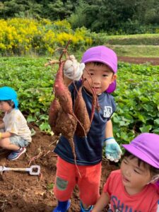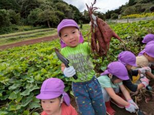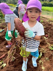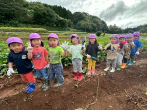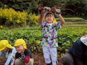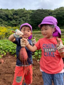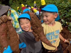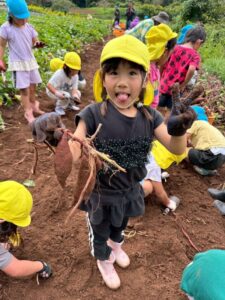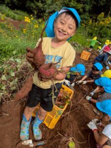 芋ほりをしました 2025.10.20 田平の畑に、菫、百合、桜組で芋ほりに行ってきました。田平の畑は山の中にあり、行くだけでも「ヨイショ!ヨイショ」とみんなで掛け声をかけながら進みました。畑に着いたとたんに「ここにある!」と大興奮の子どもたち。次々に出てくる芋に大歓声でした。顔まで泥まみれになりながら、芋ほりを楽しみました。お芋を掘った後はおいしいお弁当を頂きました。お山で食べるお弁当は格別です。お弁当の準備、芋ほり道具の準備ありがとうございました。 Tweet Share Hatena Pocket RSS feedly Pin it
