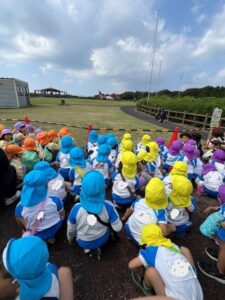 長串山のヘリコプター体験に菫・百合・桜組で行きました。いつも上空を飛ぶヘリコプターはよく見かけますが、乗ってみる(飛びませんが)体験会がありました。最初は音だけ聞こえていたヘリコプターがだんだん近づいてきて降りてきたときにはみんな大興奮、「すご~い」とみんなで手を振っていました。他の幼稚園、保育園のお友だちも来ていて、自分たちの順番が来たときは、パイロットに「どうして飛ぶんですか?」「どこからきましたか?」と質問攻めでした。中に乗ったり、ヘルメットをかぶったりと初めて体験することばかりでした。いよいよ飛び立つときはみんな離れて「また来てね~」と手を振っていました。