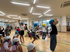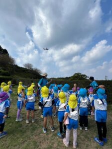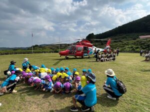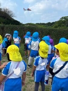 長串山のヘリコプター体験に菫・百合・桜組で行きました。いつも上空を飛ぶヘリコプターはよく見かけますが、乗ってみる(飛びませんが)体験会がありました。最初は音だけ聞こえていたヘリコプターがだんだん近づいてきて降りてきたときにはみんな大興奮、「すご~い」とみんなで手を振っていました。他の幼稚園、保育園のお友だちも来ていて、自分たちの順番が来たときは、パイロットに「どうして飛ぶんですか?」「どこからきましたか?」と質問攻めでした。中に乗ったり、ヘルメットをかぶったりと初めて体験することばかりでした。いよいよ飛び立つときはみんな離れて「また来てね~」と手を振っていました。