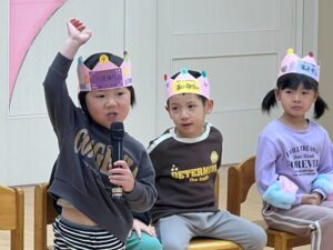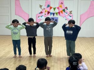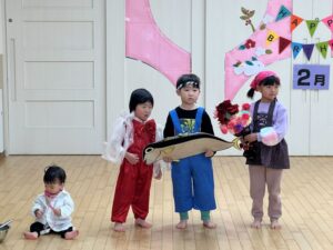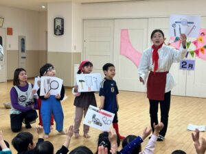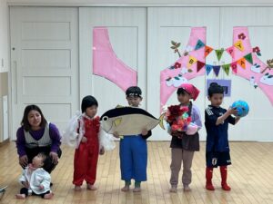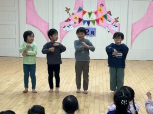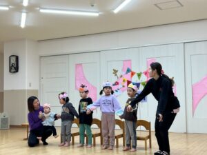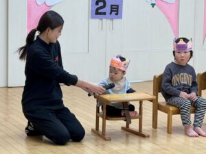 2月の誕生会を行いました。テーマは大きくなったら!誕生月のお友だちが「大きくなったらなんいなる?」と歌いながらなりたい衣装を着て出てきました。お友だちがそれを当てるゲームでした。蒲公英のお友だちが聴診器を首に下げて出てきて小さな注射をもって「チクンしたい人?」と保育士と一緒に出てきました。それからは花屋さん、アイドル、サッカー選手、さすが楠栖の子、漁師さんもいましたよ。最後は保育士の小さい頃が出てきて「だれ~?」と盛り上がっていました。