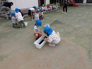 宙組 トマトの苗を植えつけました。 2025.05.15 宙組さんがプランターにトマトの苗を植えつけました。 先生のお話を聞きます。 「これはプランターといいます。」 星組さんが見学にきました。 お友達と協力してやってみよう! 他のクラスのお友達も興味津々です。 「お水をやりますよ。」 途中、虫さんを発見して大興奮。 実がなったら給食に入れてもらおうね。 Tweet Share Hatena Pocket RSS feedly Pin it