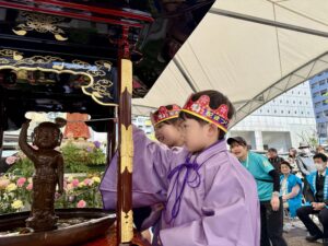 ※「花まつり」とは…お釈迦様のお誕生に関する仏教行事です。今から約2500年前の4月8日、現在のネパールのルンビニーの花園でお釈迦様はお生まれになられました。そのときお誕生をお祝いし、天から甘露の雨が降り注いだそうです。このお話を元にして、毎年4月には、誕生時に降り注いだ雨を模して誕生仏へ甘茶をかけたり、白い像に花御堂をつけて町の中を行進したりする花まつりの行事が全国各地で行われています。